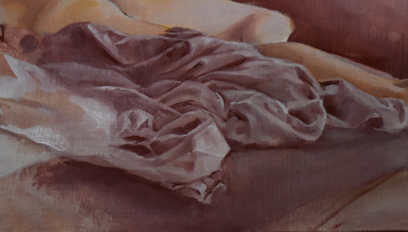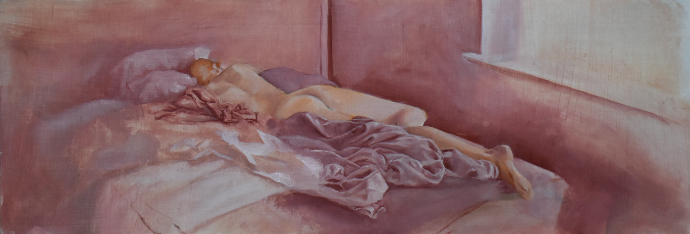 Acrylic and Oil on MDF board, this artwork shows a figure stretched out in morning light.