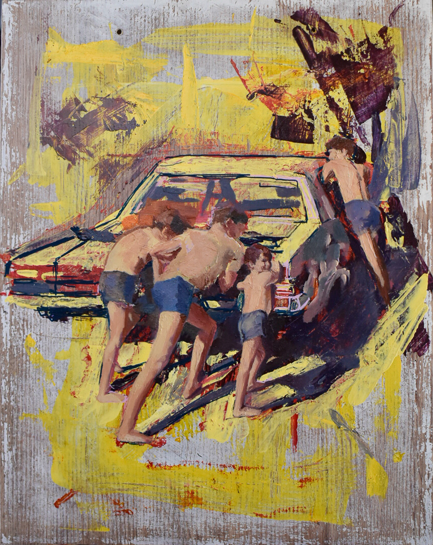 The reference image was given to me by a friend, Shane (pictured futhest right), who would push start their family car to drive to the nearest bus stop so that they could get to school from their rural property. The photo was taken on an old film camera, giving motion blurs and fuzzy, grainy delights that inspired how I undertook this work.